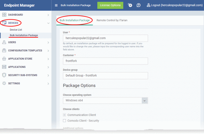 - Click 'Devices' > 'Bulk Installation Package'
